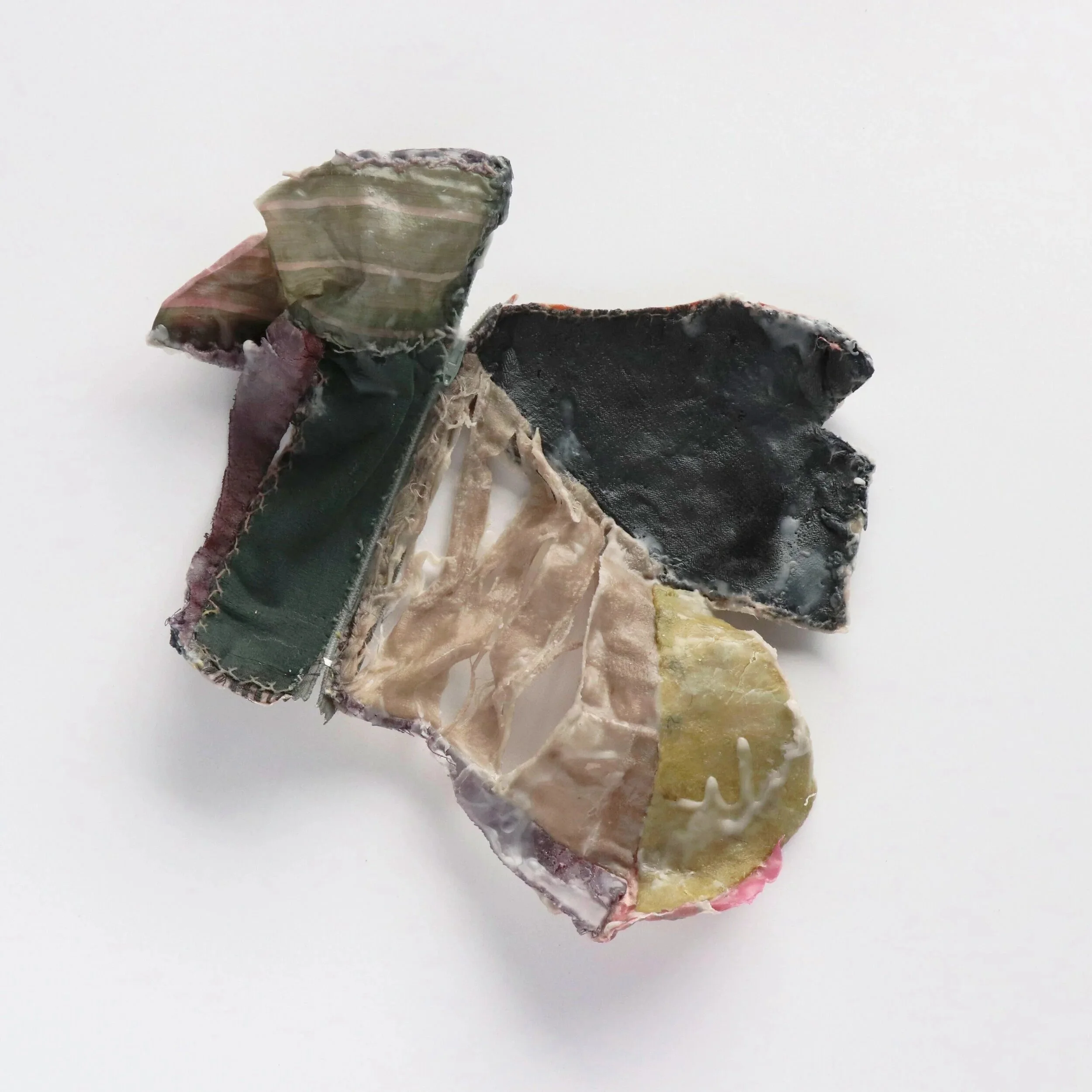 I work with old, unwanted quilts, transforming them by immersing them in melted encaustic. As they are lifted from the liquid, I reshape them while they cool and harden. The act of redeeming salvaged forms and holding them in a moment of restoration is deeply empowering. The dejected materials I use carry stories connected to my own.